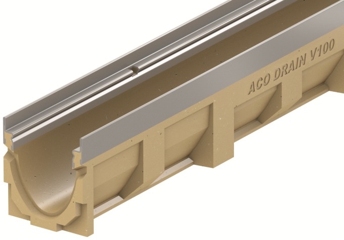 Multiline afløbsrende, type V100S. Med integreret kantprofil af galvaniseret stål. Med integret ristelås. Af polymerbeton. Med æggeformet profil der giver en højere fyldhøjde ved lavere vandgennemstrømning og dermed en højere gennemstrømningshastighed, hvilket giver en øget selvrensningseffekt.