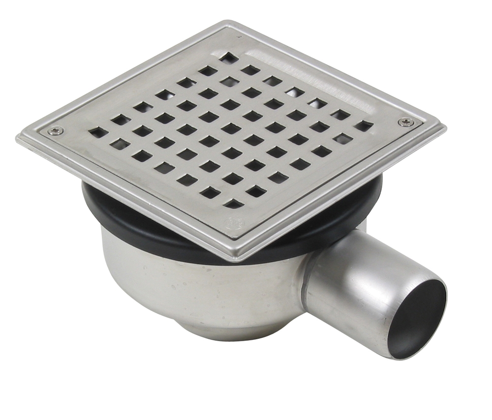 BLÜCHER Domestic-150 justerbar afløb for beton- og klinkegulve, med vandret Ø50mm udløb. Lav model uden membranflange