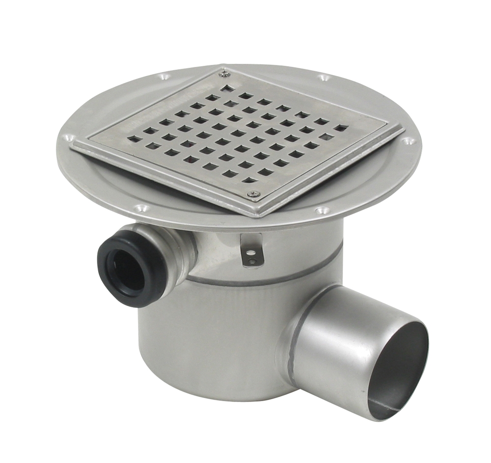 BLÜCHER Domestic-150 justerbar afløb for beton- og klinkegulve, med sideindløb og vandret Ø75mm udløb, med membranflange