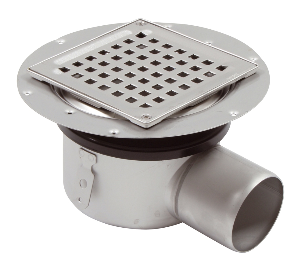 BLÜCHER Domestic-150 justerbar afløb for beton- og klinkegulve, med vandret Ø75mm udløb, med membranklemflange