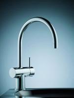 Fra de klassisk svungne linier i køkkenarmaturet til det mere minimalistiske formsprog i badearmaturet.