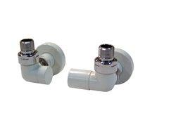 komplet vinkelløbende ventilsæt inkl. tilslutningsstykke og roset. Manuel fremløbs- og afspærrings-(retur) ventil.
