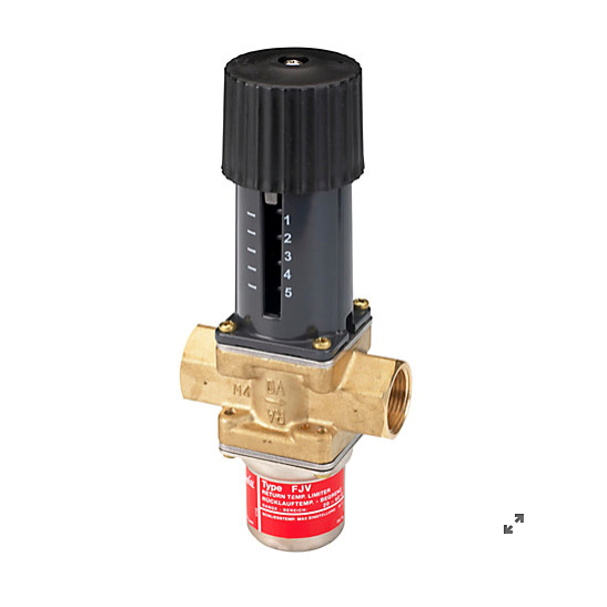 Returløbstermostat til automatisk regulering af returvandstemperaturen fra varmtvandsbeholdere, der er direkte tilsluttet fjernvarmeanlæg, og fra blandesløjfer i fjernvarmeanlæg. FJV sikrer, at returvandet er afkølet til den ønskede temperatur, før det strømmer tilbage til fjernvarmeanlægget. Lukker ved stigende temperatur