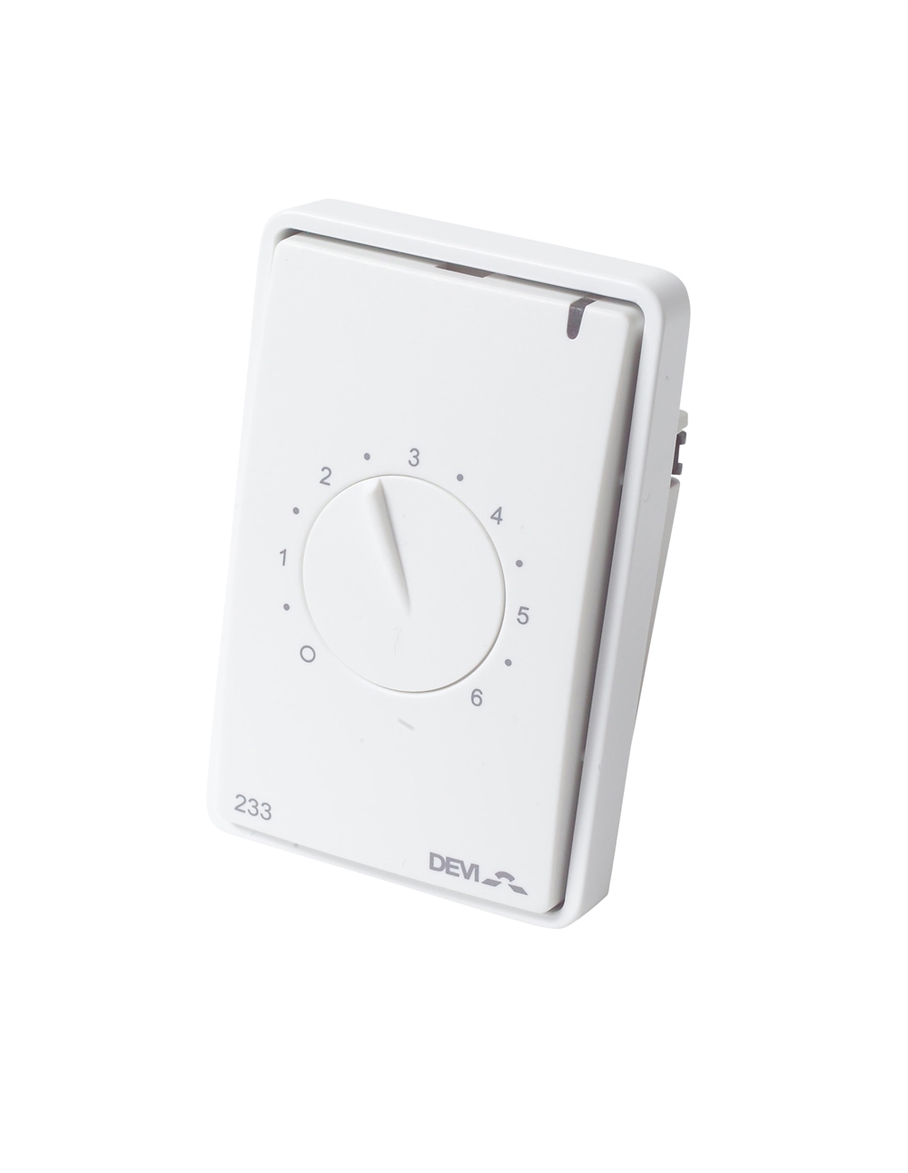 Devireg™ 233 er en elektronisk termostat med mulighed for fastlåsning af temperaturindstillingen, termostaten er beregnet for montage i LK´s Fuga rammesystem.