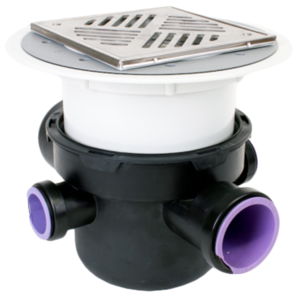 Gulvafløbet har 3 tilløbsstudser 2/Ø50 og 1/Ø75 samt udløbstuds på Ø110 mm.