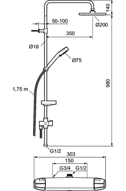 • Loftbrusersæt med stort bruserhoved Ø200 mm., håndbruser med 2 stråle indstillinger, Chromalux slange, integreret omskifter og sæbeskål. Både Loftbruser og håndbruser er med Eco Flow 12 l/min og kalkafvisende si.