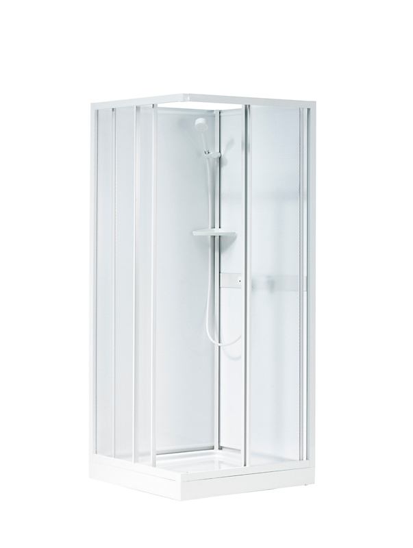 Top-og bundprofilen giver en stabil kabine. Kabinekar i hvidemaljeret stålplade. Justerbare ben gør at brusekabinen altid står lige på gulvet. Ifö Next brusekabine NKH med klassisk hjørneindgang og skydedøre, har glatte hvide bagstykker som effektivt skjuler f.ex. væg-og rørinstallationer, eller andet som ikke skal ses.