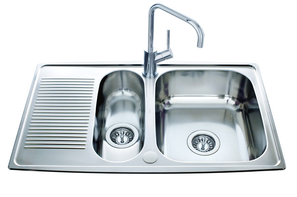 Vendbar køkkenvask med stor vask og lille kumme med rillefelt.