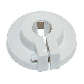 Stuer todelt Plastroset. Rosetten monteres når rørinstallationen er færdig. Rosetten vrides om røret og klemmes sammen uden lim.