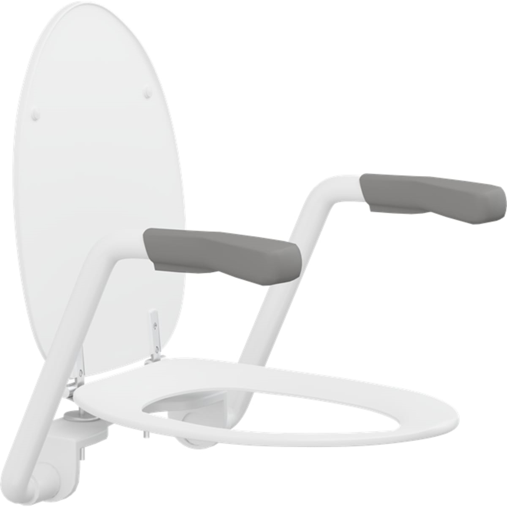 Da armstøtterne kan slåes individuelt op, optager de ikke unødvendig plads i rummet, når de ikke er i brug. Armstøtten leveres med et Pressalit R37 Dania toiletsæde, og tåler en maks belastning på 140 kg.