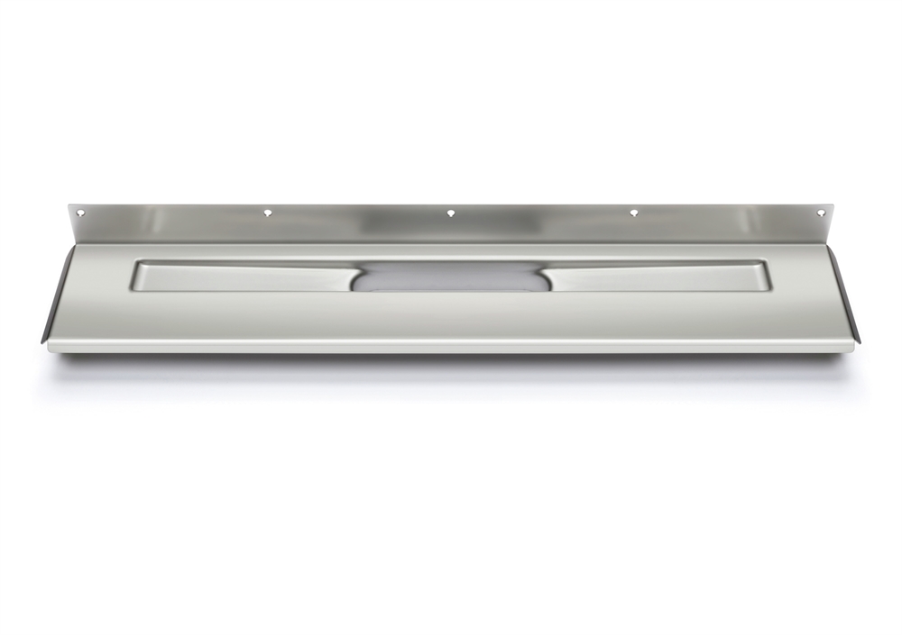 Afløbsarmaturet har en vægflange og tre gulvflanger, og er formgivet ud af et stykke kraftigt 1,5 mm rustfrit stål med bejdset overfladefinish.