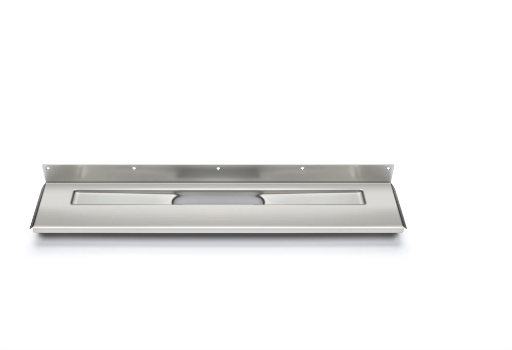 Afløbsarmaturet har en vægflange og tre gulvflanger, og er formgivet ud af et stykke kraftigt 1,5 mm rustfrit stål med bejdset overfladefinish.
