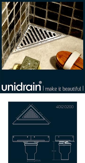 Unidrain hjørneafløb passer mod et hjørne med 2 vægflanger og en gulvflange. Rammen passer til 8mm fliser + 2mm flisekæb og membran (10mm ramme)