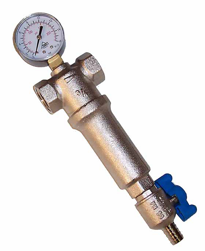 CMA SELF-CLEAN vandfilter i metalhus med 100 mikron permanent trådvævsindsats. Max 100° C, incl. manometer